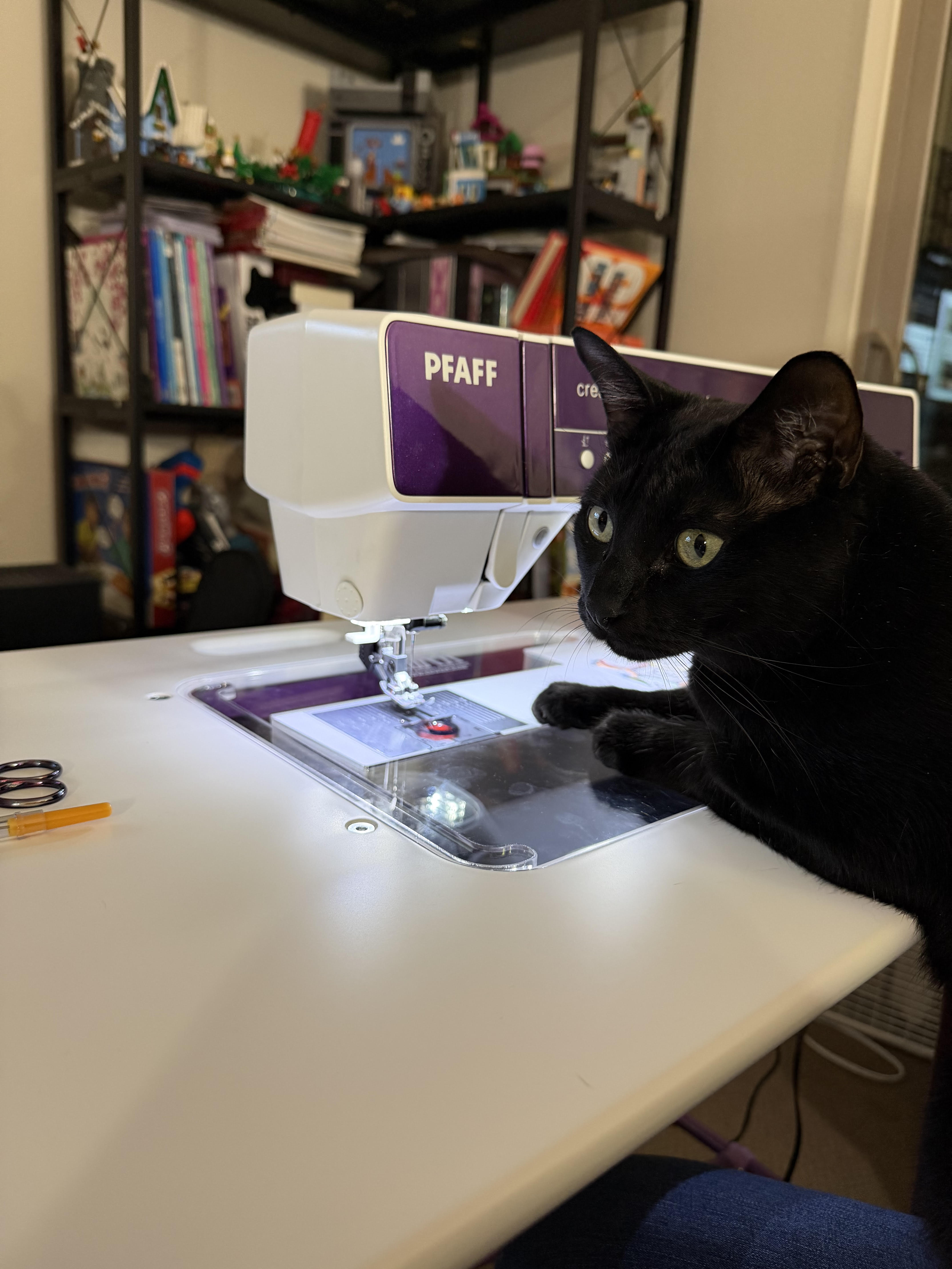 About me: Well, there is the about me page…but I thought I would go into a little more detail here. My name is Damon and I reside in Wisconsin with my wife, Kinsey, and our two cats: Cricket and Tink. I have a LOT of hobbies (I think my wife would argue too many): cycling, playing video games with my college best friend, camping, cross stitch, quilting, and taking quilting classes with my wife! This year (2025), I got into quilting after my wife got her new sewing machine and I inherited her old one. We found a beginner’s quilt making class at our local quilt shop, signed up, and I fell in love with quilting! The precision and creativity really drew me towards the craft, as well as watching the project slowly come together. As I have continued to quilt this year, I wanted to share my love with others and to grow a welcoming community of fellow quilters. Then…as I am piecing a special quilt (a post on that coming soon), my cat Cricket jumped up and sat at the sewing machine. Boom, “Cricket Quilts” came into my mind and I was ready to start this blog. I am not a writer (trust me, my English grades can back this up) but I felt this was the best way to express myself. Please forgive my grammatical errors that will inevitably continue to happen, but we can hope that they get better over time. 🙂